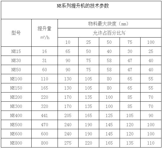 NE15、NE30、NE50、NE100、NE150、NE200、NE300、NE400型提升機(jī)的較大提升量、較大提升高度及動力配備